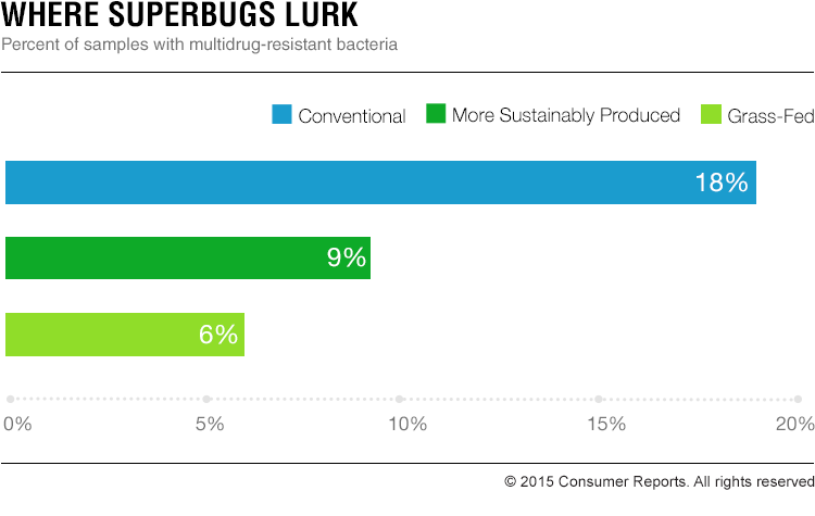 Superbugs are bacteria that are resistant to three or more classes of antibiotics, making infections caused by them difficult if not impossible to treat. In our tests of 300 samples of raw ground beef, we found that conventional beef was twice as likely to be contaminated with superbugs than was all types of sustainably produced beef. But the biggest difference we found was between conventional and grass-fed beef. Just 6 percent of those samples contained superbugs.