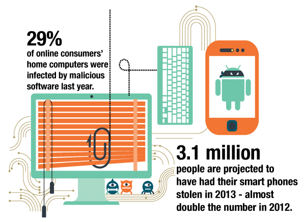On your computerThe arsenal of scams and attacks aimed at your computer is truly breathtaking. It includes websites that push "drive-by download" malware onto unsuspecting visitors and "ransomware" that encrypts the data on your computer, then charges you to get it back. And every year, e-mail phishing gets more sophisticated. Gone are the badly spelled blasts from Nigerian princes. Newer targeted messages appear to come from legitimate companies such as UPS, PayPal—even the company you work for. Last year, we project, 11.2 million fell for such scams, up 22 percent from the year before, according to the latest survey conducted by the Consumer Reports National Research Center.