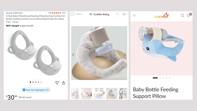 We found infant self-feeding pillows priced between $14 and $40 on Amazon, Walmart, and independent websites. Many of the infant self-feeding pillows we found in our research were manufactured overseas and sold by third-party sellers, making accountability and oversight more difficult. When we brought these products to the attention of Amazon and Walmart, the platforms worked to remove the products that we found, but others may remain.