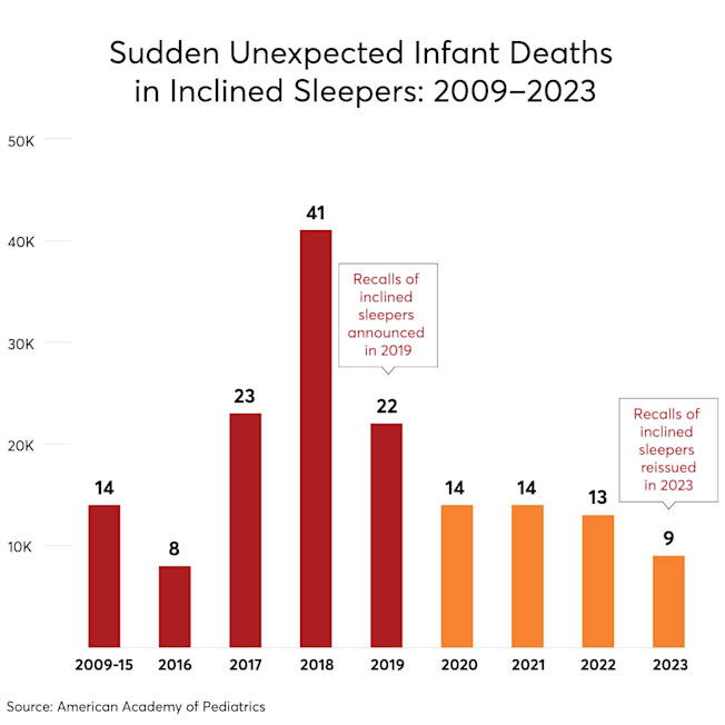 Data from the American Academy of Pediatrics show infant deaths continue to be linked to inclined sleepers years after they were recalled