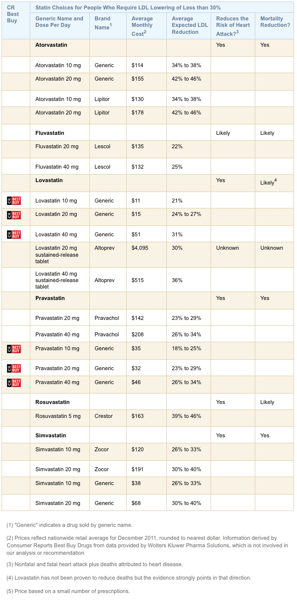 Statins can vary widely in cost as well—from as little as $12 per month (and even less if your drug is available on a drug store's discount generic list) to more than $500. Most people who take them must continue to do so for years—perhaps for the rest of their life—so the cost can be an important factor to consider.