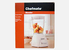 The recall affects Chefmate 6-speed blenders, model BL-10, which feature a six-inch tall white motorized base with six buttons. (The model number is imprinted on the bottom of the motor unit.) The clear plastic pitcher features a white cap along with a white plastic base which holds the blender's two angled, stainless steel blades.