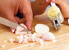 Let's start with knives. In Consumer Reports' latest Ratings of 50 knife sets, we generally favored forged knives over those made from stamped metal for sharpness and precision—two qualities needed to efficiently mince tiny cloves. While a chef's knife is ideal for chopping onions and other large vegetables, the more compact handle and blade of a utility knife might be better suited to garlic. We always recommend trying knives in the store to make sure they sit comfortably in your hand.