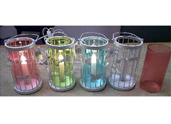 The recall affects Hurricane Style Light, a circular lamp with a white metal basket and moveable handle for hanging or carrying at the top. It has a colored glass insert in blue, pink, or green and uses a mini light bulb. The model number "DML0593" and SKU/UPC number "000015806710" are printed on the price tag attached to the product.