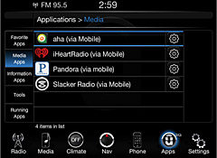 Uconnect Access Via Mobile allows users to stream audio from their smart phone, using an existing data plan, into the infotainment system. Aha, iHeart Radio, Pandora Internet Radio, and Slacker Radio services work with the system, allowing song skipping, favorite stations, and other common controls to be accessed via the steering wheel and touch screen.