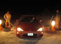Time to implement Plan B. We bought a kerosene heater at local general store to thaw the engine and fuel lines. However, the heater required electricity to force the hot air out. Thankfully, our Infiniti JX had an outlet. But just as soon as we thought we were on a "hot" streak, the extension cord we had became too brittle to use.