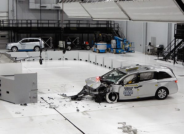 At the Insurance Institute for Highway Safety (IIHS), destroying cars is part of the daily routine. We visited their impressive Virginia facility recently and watched as they crashed a $33,000 Honda Odyssey into a 320,000-pound concrete slab for their new small-offset crash test. The Institute is still tabulating the results, so we can't announce what rating it will get, but IIHS and Honda officials were expecting it would score well.