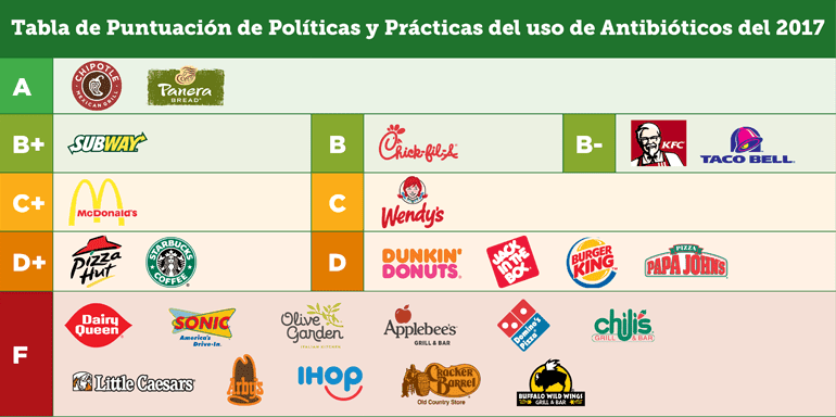 Burger King, Dunkin’ Donuts, Jack in the Box y Starbucks subieron de una F el año pasado a una D, uniéndose a otros como Papa Johns y Pizza Hut. Estas cadenas recibieron una calificación de “D” por tener políticas limitadas sobre antibióticos o por no implementarlas en su totalidad aún.