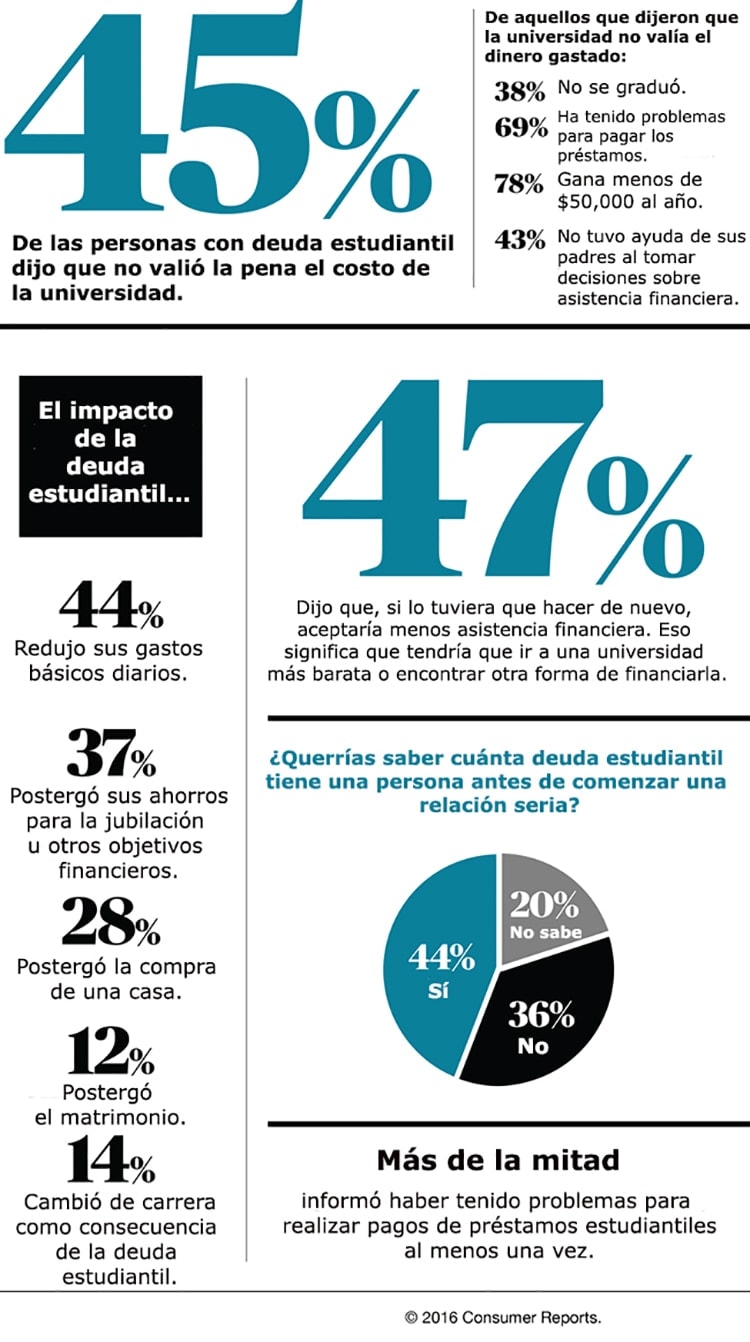Los datos son congruentes y convincentes: Dado que una educación universitaria se traduce en un futuro mejor, vale el dinero que gastes en ella. Pero intenta decírselo a los 1,500 estadounidenses con deuda estudiantil que respondieron a una encuesta nacionalmente representativa del Centro Nacional de Investigaciones de Consumer Reports en marzo de 2016. La carga de la amortización de préstamos significativos ha dejado a muchos preguntándose, después de los hechos, si valió la pena el costo de la universidad.