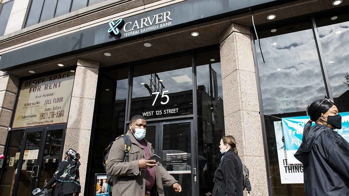 Foto: Los peatones pasan frente a una sucursal de Carver Federal Savings Bank en el barrio de Harlem de la ciudad de Nueva York en octubre de 2020.