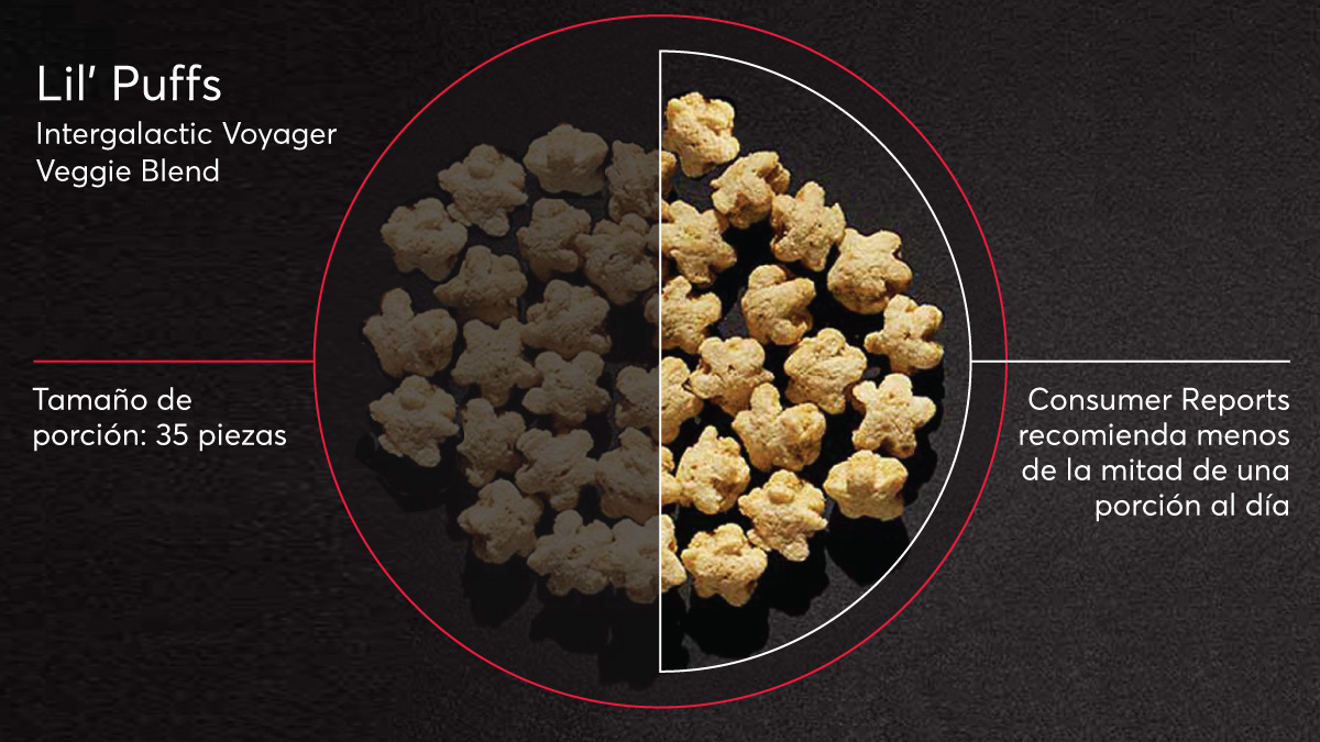Y Rogers apunta: “El tamaño de las porciones de estos bocadillos es más pequeño de lo que un padre puede imaginar”. Una media porción de Lil’ Puffs Intergalactic Voyager Veggie Blend de Lesser Evil (también vendida como Voyager Veggie Blend Puffs) tiene solo 17 piezas. Un recipiente de bocadillos Serenity Kids tiene capacidad para solo 1 ½ onza y la etiqueta dice que contiene seis porciones. “Intenta decirle eso a los niños pequeños que, si tienen la oportunidad, pueden comerse un recipiente entero de una sola vez”, añade Rogers.