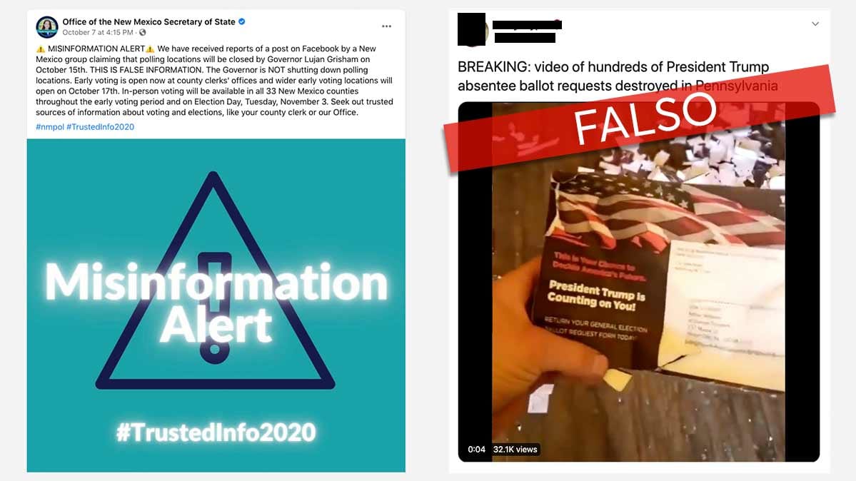 En un ejemplo destacado de principios de octubre, el secretario de estado de Nuevo México desacreditó una publicación de Facebook que indicaba erróneamente que los lugares de votación iban a cerrar el 15 de octubre. De hecho, la votación anticipada ya está en marcha en el estado y continuará hasta el 31 de octubre. Luego, por supuesto, las urnas estarán abiertas el día de las elecciones.
