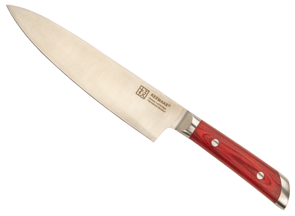 The Keemake 8" Chef Knife has a more narrow cutting angle than traditional European cutlery, like an Asian knife. And while I’d love nothing more than to tell you that it held its own against the pricier picks, the truth is, the knife proved problematic.