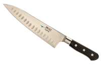 Mac knives try to blend the best elements of German and Japanese design, with thinner Japanese blades and more traditional European handle styling. The Mac Professional Series 8" Chef’s Knife, which features dimples on the blade designed to release food, proved to be just fine for panelists with small hands, but those with larger hands complained that the handle was small. There were a number of issues with the knife in our testing. One panelist complained of rough edges, another experienced cramping, and a third said it could become slippery when wet.