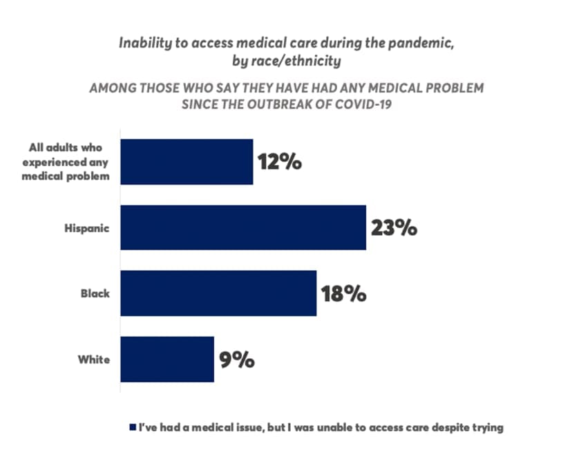 White adults are the least likely to experience difficulty accessing medical care when they have a health issue, compared to Black and Hispanic adults. Among those who reported experiencing any medical problem in the past year, 23 percent of Hispanics and 18 percent of Blacks said they were unable to access care despite trying (versus 9 percent of white adults who had a medical issue that say so).