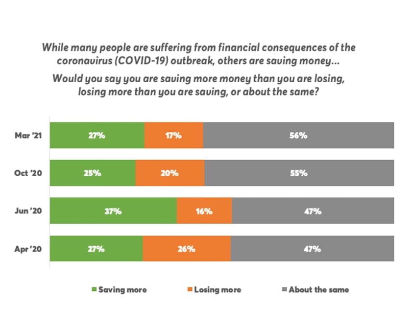 Despite those individuals suffering negative financial impacts from job and income loss, there is a sizable portion of Americans who are coming out ahead financially during the outbreak, thanks to trends such as reduced commuting costs, using fewer services, and engaging in fewer activities. Slightly over a quarter (27 percent) said they are saving more money now than they are losing, and a majority of Americans (56 percent) said they are netting about the same when it comes to saving versus losing money.