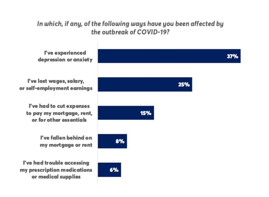 The pandemic continues to take a toll on mental health. Overall, 37 percent of Americans said they had experienced depression or anxiety due to the pandemic; that’s compared to 40 percent in December.